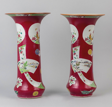 A Fine Pair of Ruby Ground Rooster Beaker Vases